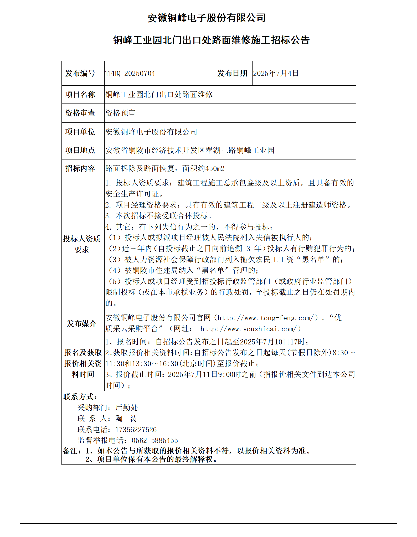 安徽銅峰電子股份有限公司 (銅峰工業(yè)園北門(mén)出口處路面維修招標(biāo)公告)_01