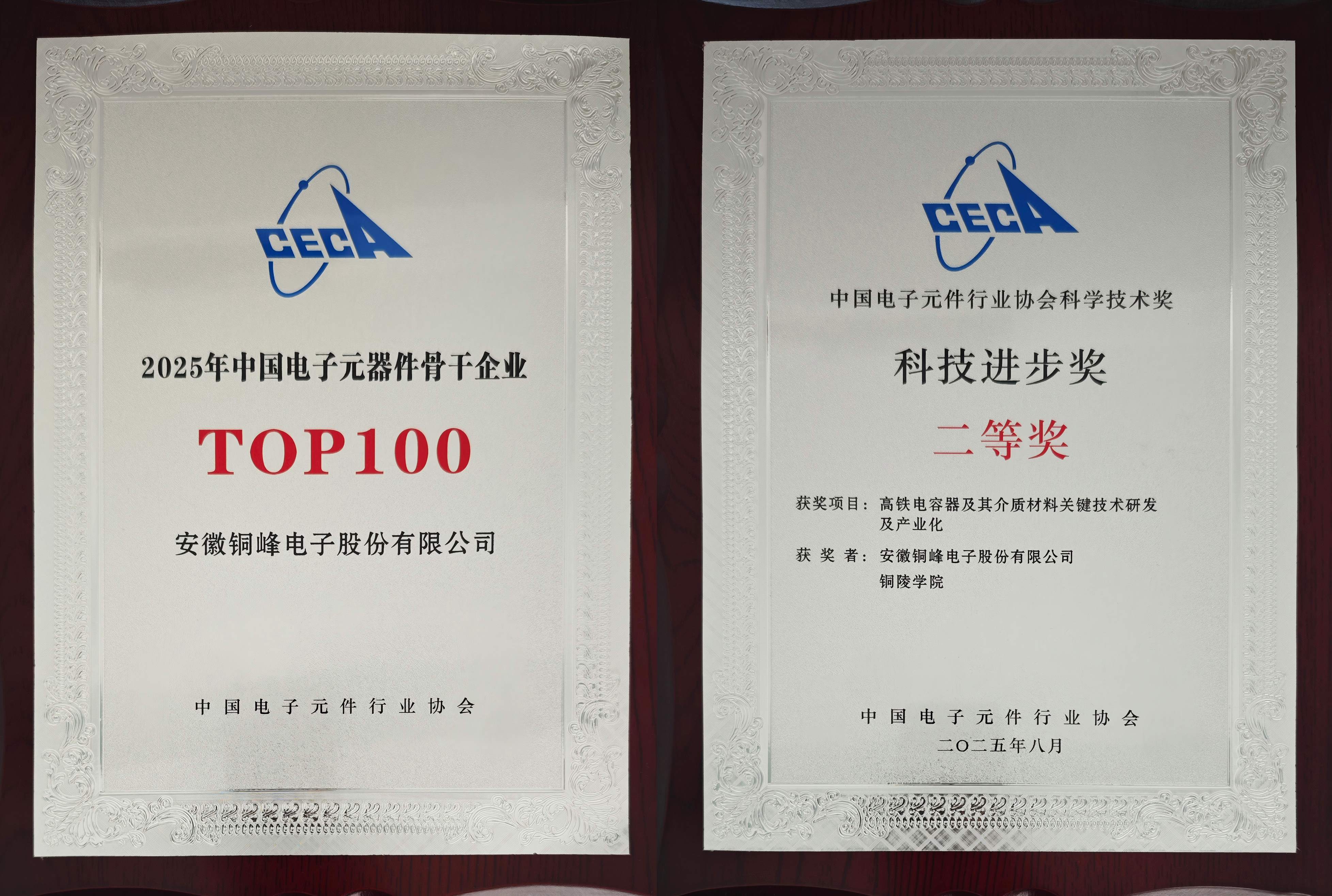 會(huì)議過(guò)程中,除舉辦主題演講、高端對(duì)話、分會(huì)平行論壇外,還舉行了2025年中國(guó)電子元器件骨干企業(yè)、2025年度(第3屆)中國(guó)電子元件行業(yè)協(xié)會(huì)科學(xué)技術(shù)獎(jiǎng)?lì)C獎(jiǎng)儀式,公司連續(xù)三十余屆獲評(píng)“中國(guó)電子元器件骨干行業(yè)TOP100 ”榮譽(yù),并榮獲中電元協(xié)科技進(jìn)步二等獎(jiǎng)。