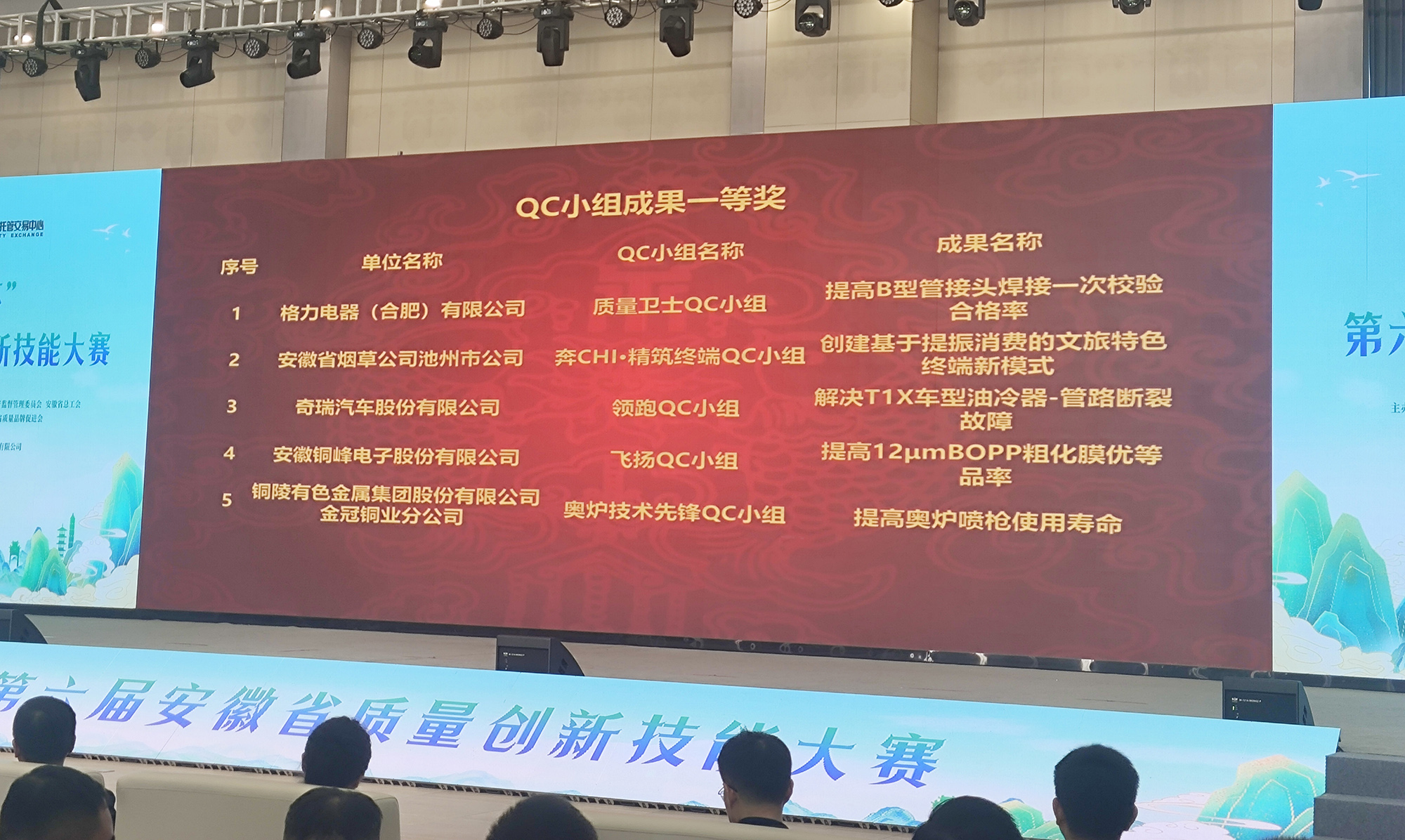 近日,“歙采繽紛杯”第六屆安徽省質量創(chuàng)新技能大賽在黃山市歙縣圓滿落下帷幕。公司在此次大賽中表現(xiàn)亮眼,三組參賽團隊歷經(jīng)激烈角逐全部斬獲獎項,分別榮獲QC成果一等獎1項、三等獎2項,以硬核實力彰顯企業(yè)質量創(chuàng)新風采。